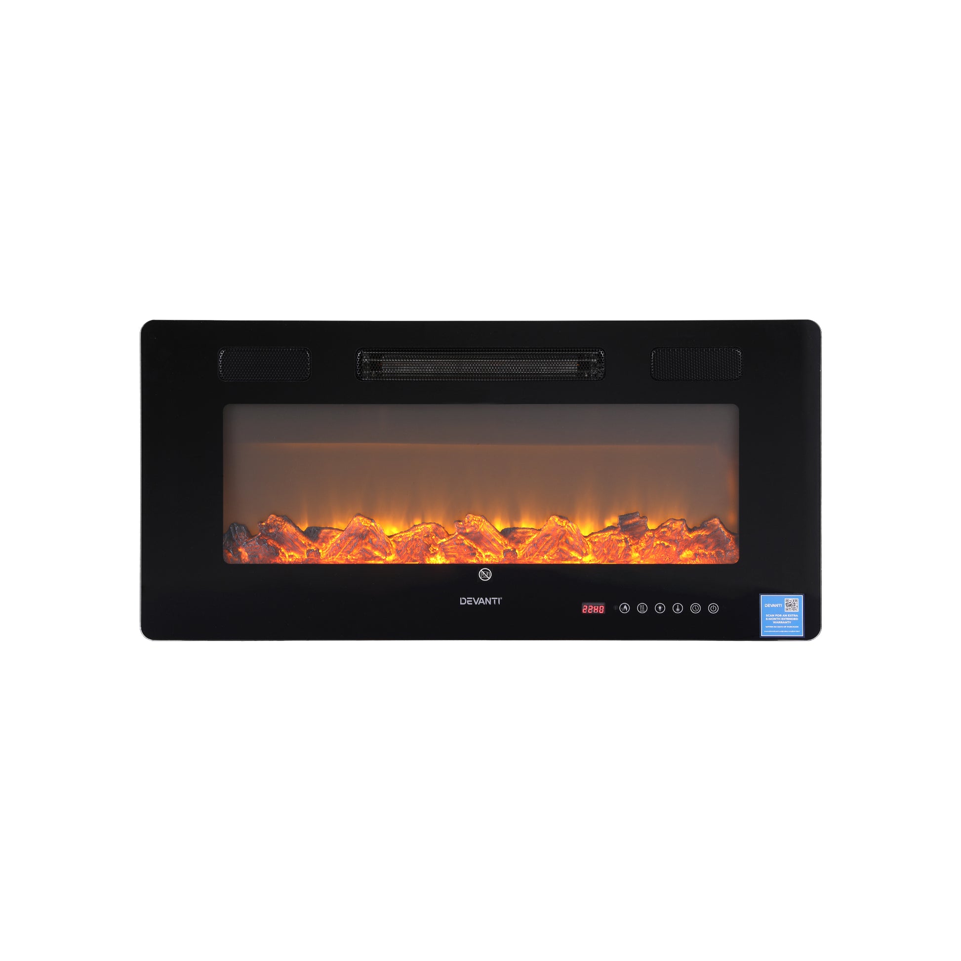 Add modern warmth and ambience to your home with the Devanti Electric Fireplace. This versatile unit can be wall mounted or recessed for a flush, contemporary look. Featuring 6 realistic flame colours and two heating powers (1000W/1800W), it provides both visual appeal and comfortable warmth. Control everything easily with the included remote, digital thermostat, and timer(0-12H). Designed for Australian power outlets and built with safety in mind.