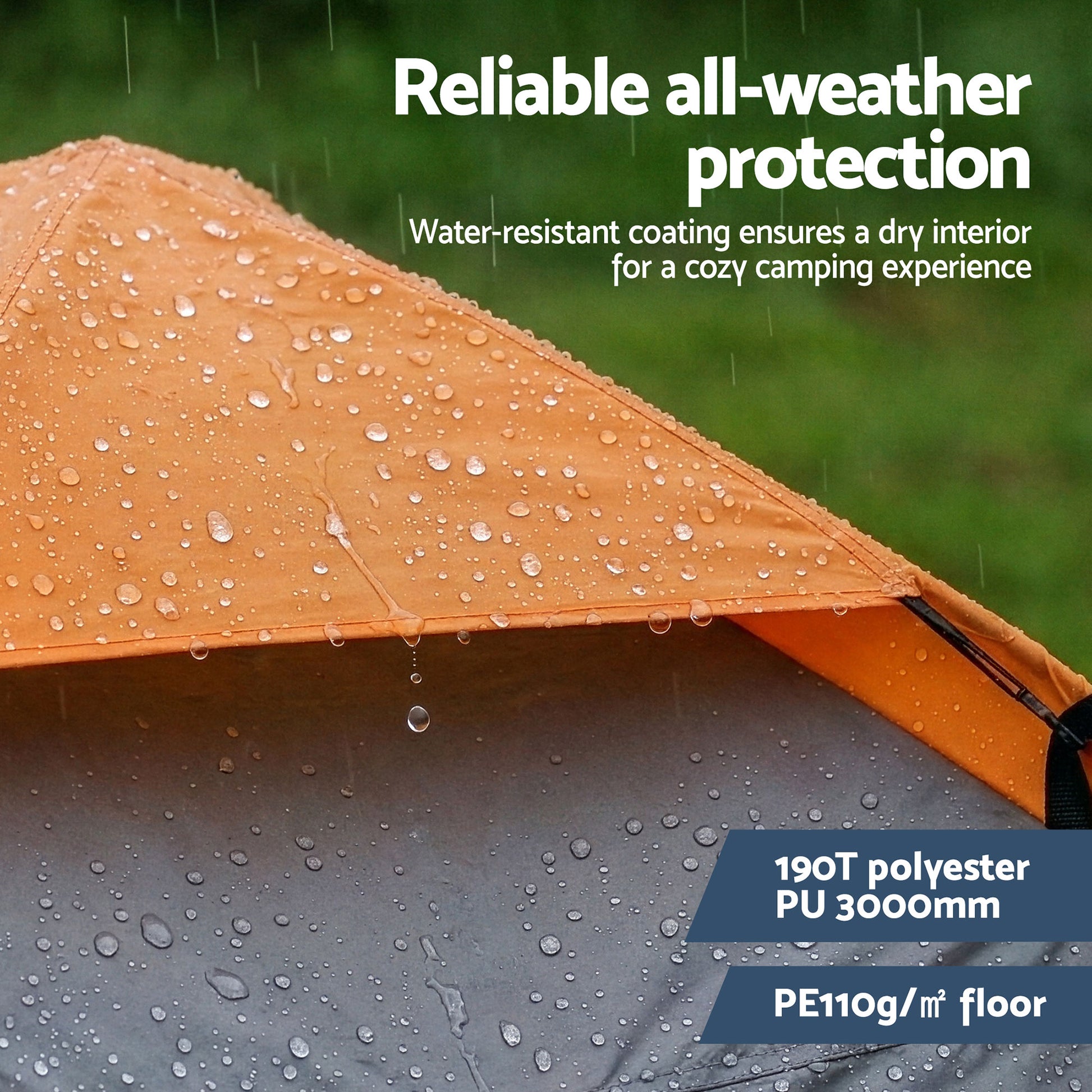 PU3000MM WATER RESISTANCE: Don't let a downpour ruin your trip. The 190T polyester rainfly with a 3000mm rating provides reliable shelter, while the reinforced PE floor prevents moisture seepage.