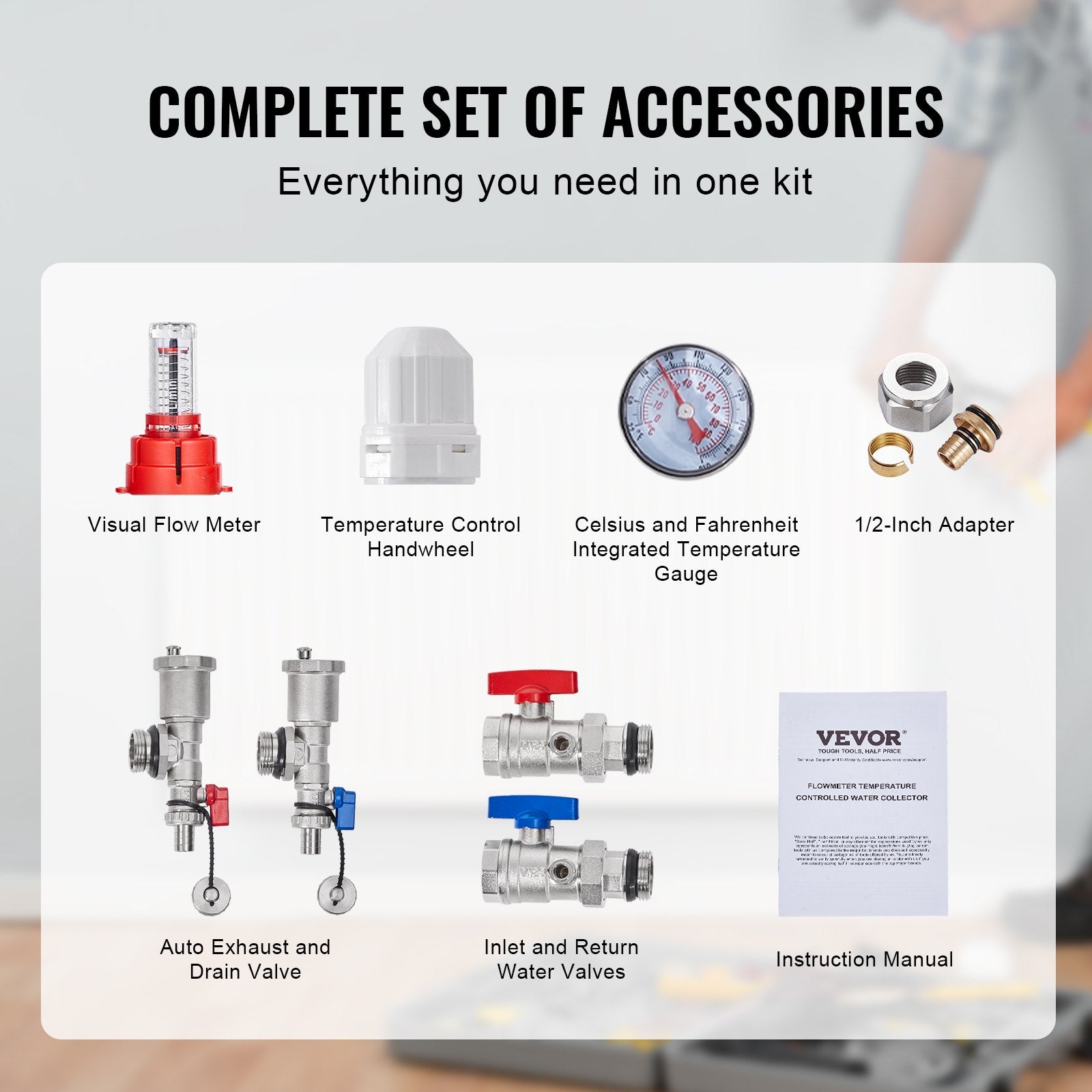 This radiant heat manifold features 12 branches, 1-inch G-threaded supply and return ball valves, and supports a flow rate of up to 5L/min. It includes 1/2-inch adapters and 2 temperature gauges (display both Fahrenheit and Celsius), making it an ideal choice for efficient radiant floor heating systems.