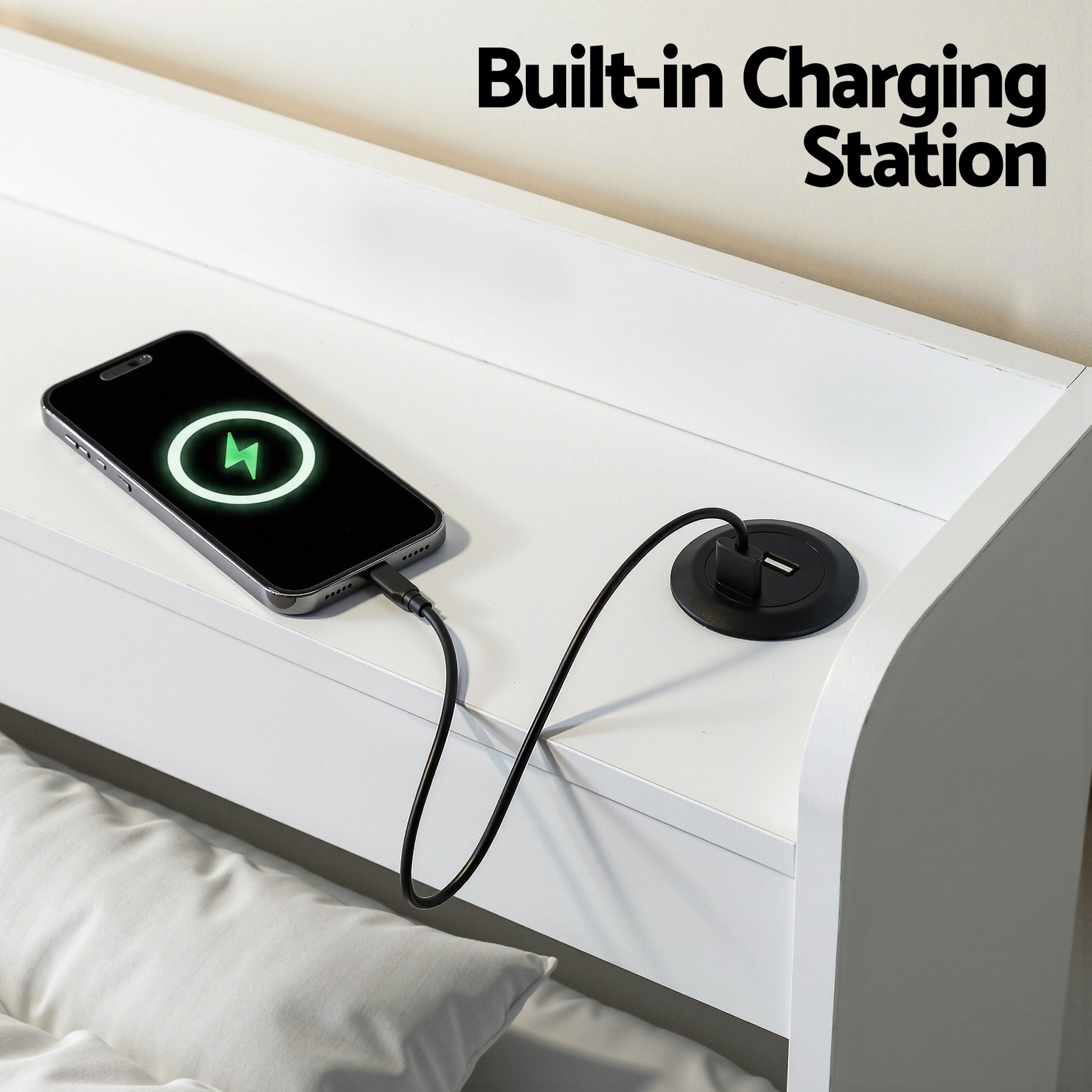 It's easy to sleep well on the Artiss Aura Bed Frame. Made from thick 15mm and 18mm particleboard with 12mm plywood slats and a white paper finish, the bed frame is designed for long-lasting use and longer-lasting sleep. The thick plywood slats and centre beams provide total support, and noise-free use, and improve the life of your mattress. It features a multifunctional design that allows you to use the bed for storage and to charge your phone overnight. Two drawers with smooth castor wheels can be installed on the left or the right for convenient storage. The headboard has smooth edges and plenty of room for your bedroom essentials. It also features two USB charging ports connected to a 200cm cable for convenience. While you power down for the night, you can power up with the Aura Bed Frame from Artiss.