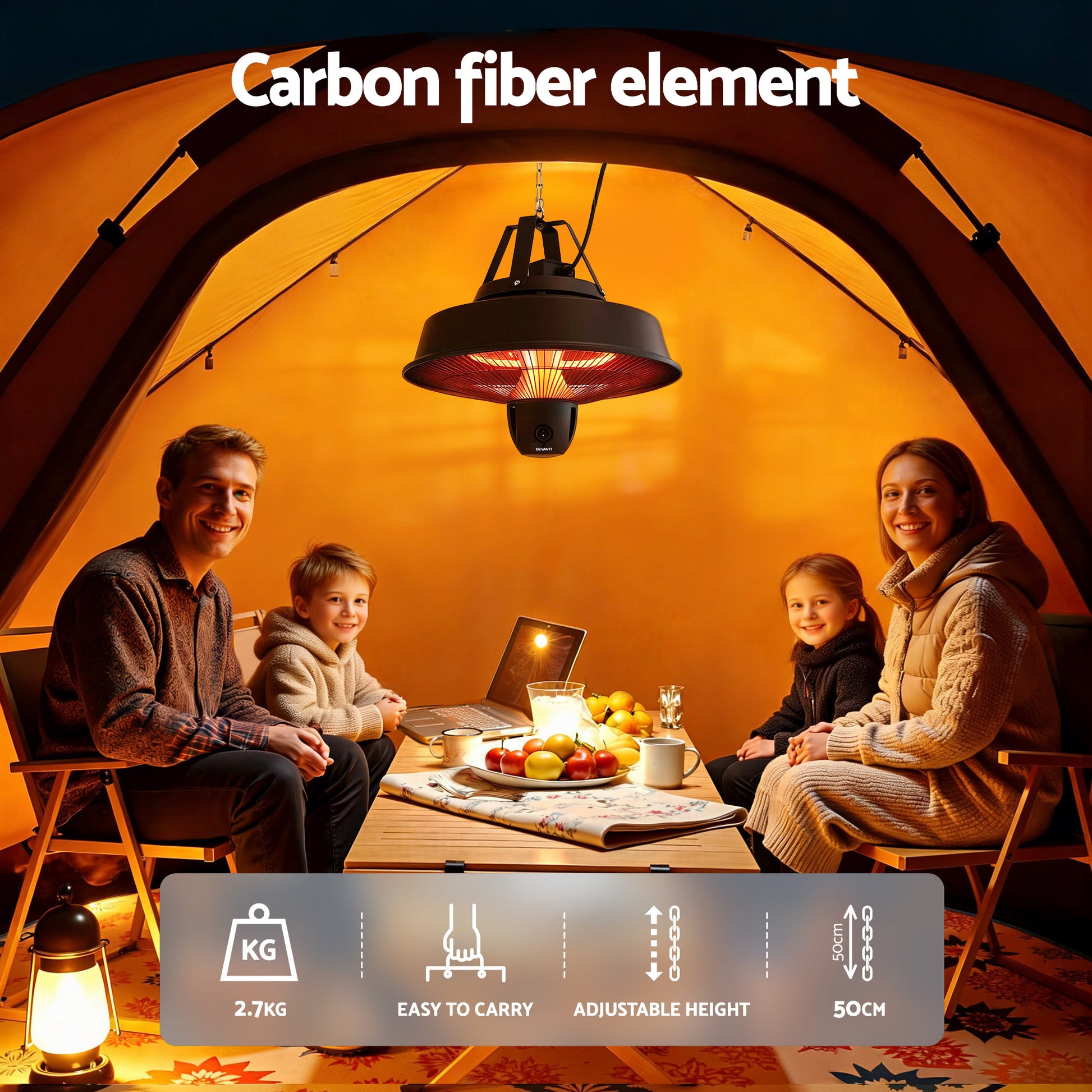 Stay warm in any indoor or outdoor environment with the Devanti Infrared Heater. Featuring a 360° remote control for easy operation, adjusting the heat or turning the heater on/off is simple and convenient. With 3 adjustable heat settings (800W, 1200W, 2000W), you can easily customize the warmth level to match your comfort needs, whether you're looking for a gentle glow or powerful heating. Its adjustable height lets you customise the positioning to suit your needs, while the weather-resistant IPX4 rating ensures durability, even in outdoor settings. The efficient and cost-effective electric heating covers a 360-degree area, providing warmth throughout your space. Built with a metal body and carbon fiber tube, this heater is designed for both residential and commercial use.