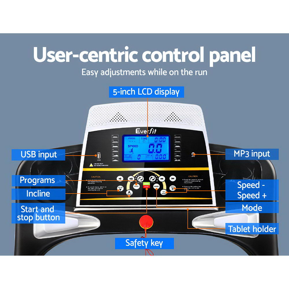 Compact and sturdy with its powder-coated steel frame, our Everfit Electric Treadmill allows you to perform essential cardio exercises within the comfort of your home. It features 12 pre-set training programs designed to simulate natural terrain. A user-centric control panel with a digital LCD display lets you set up to 18 speed levels and other monitoring parameters. Its powerful motor produces smooth and seamless operation and the anti-slip belt and soft-grip handlebar with pulse sensors make your session a comfortable and controlled experience. Other great features include a 15-level inclination adjustment, innovative double shock absorption system, automatic motor and belt lubrication, safety tether key, hydraulic fold-down for easy folding and storage, and smooth wheels for easy mobility. Not least, the treadmill is also equipped with USB and MP3 connection, twin speakers and dual drink holders to keep you entertained and hydrated. Best of all, the treadmill has a multifunctional workout system built in with a massage belt, sit-up bar and two dumbbells to allow for more fun and varied exercise.