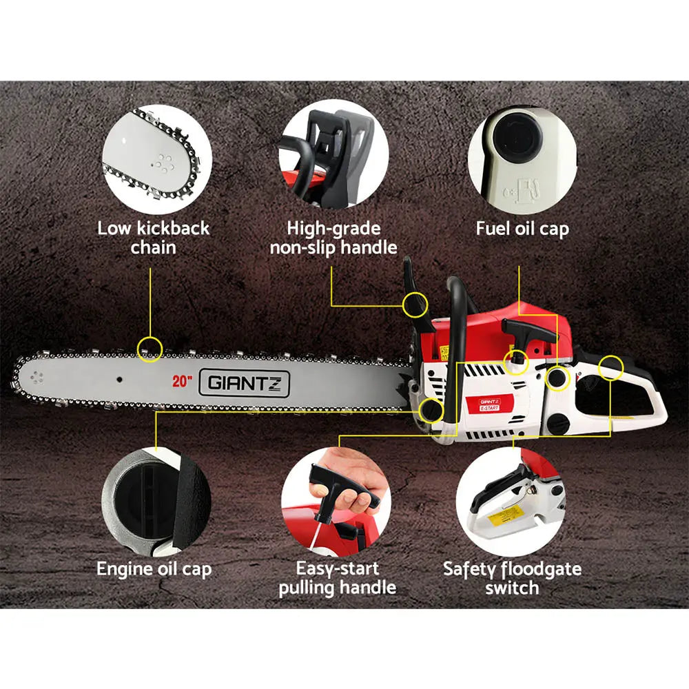 An essential tool of the trade, the Giantz Pro Series Petrol Chainsaw is a must-have for any tradesperson or gardener, whether you'meiyou re commercial or home-based. Thanks to its direct air injection carburettor, it is built for high-power, high-speed cutting. It features a balanced design for ease of use and maneuverability, while the built-in anti-vibration system keeps fatigue at bay - perfect for those long jobs. It uses a double recoil pulling system for easy start-up, while the adjustable automatic oil feeding system allows you to set and forget your chain lubrication for a smooth cut in any condition. The chainsaw features a quick tension chain mechanism to adjust the chain easily and efficiently, and the integrated chain brake helps to keep you safe. With easy access to the engine, filters and spark plugs, maintenance is easy. Your purchase comes with a bonus saw chain, spark plug, tool set and safety gear, so you'll have everything you need to get started. Trust the pros and add the Giantz Pro Series Petrol Chainsaw to your collection today.