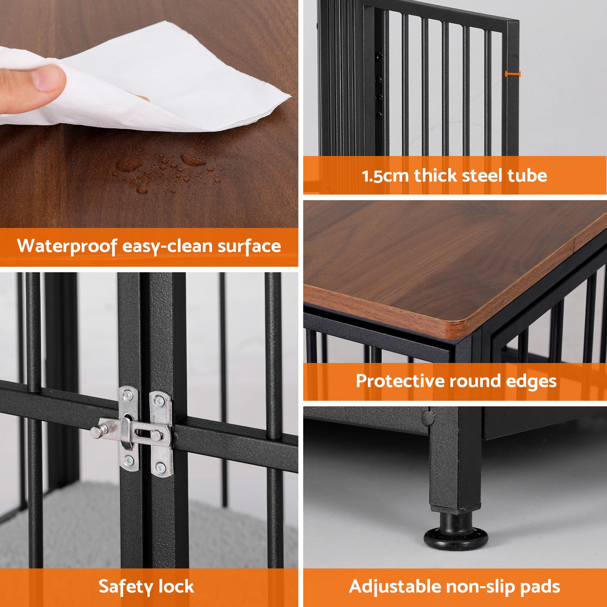 Built tough with a 1.5cm thick square steel frame and 8.3mm reinforced mesh, it's durable enough for energetic pups. The waterproof easy-clean top works perfectly as a side table, while thoughtful details like rounded edges and adjustable non-slip pads protect your floors and family. Complete with a breathable soft cushion, it offers the ultimate in comfort and style.