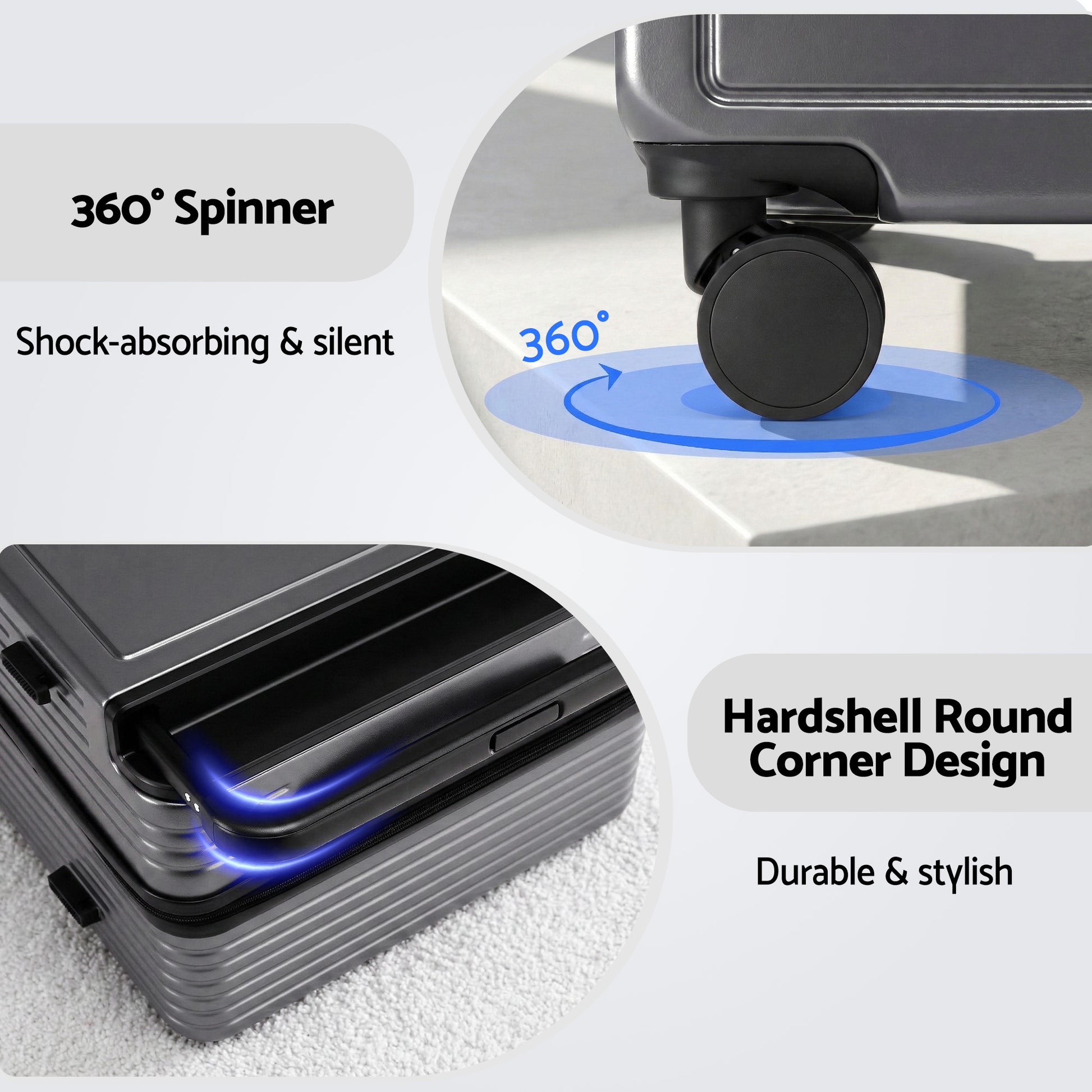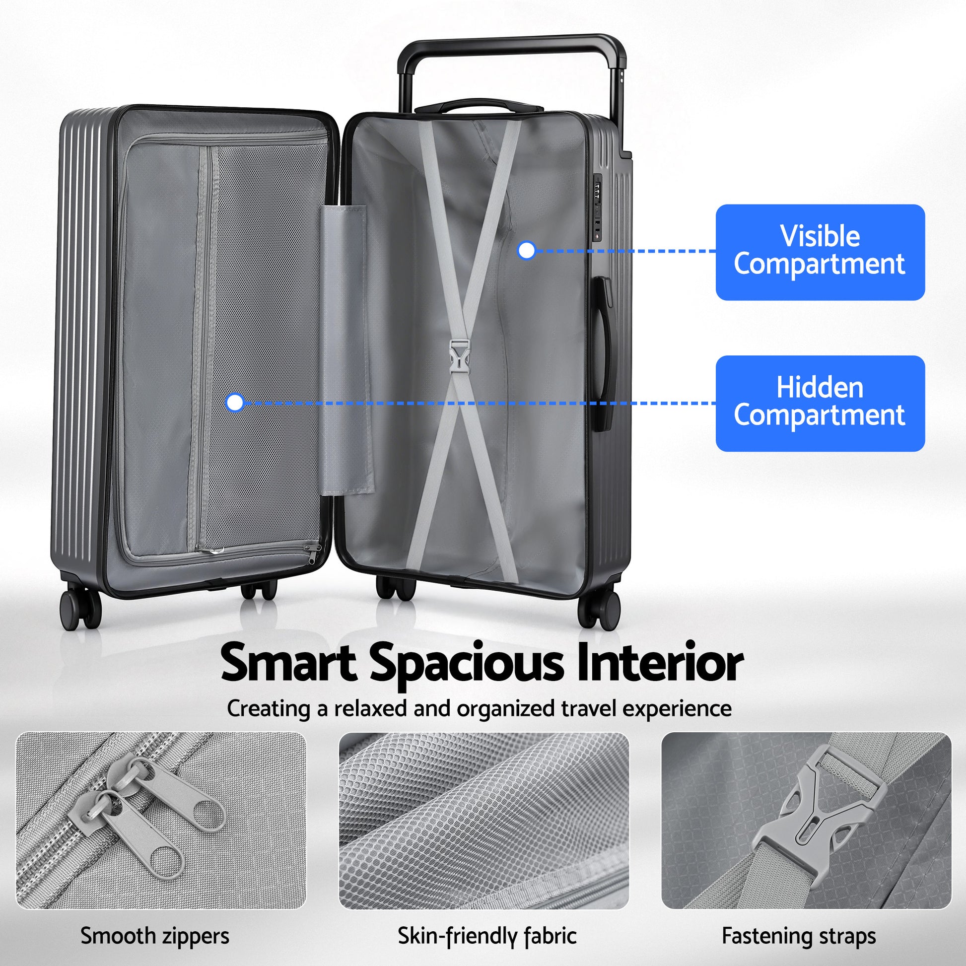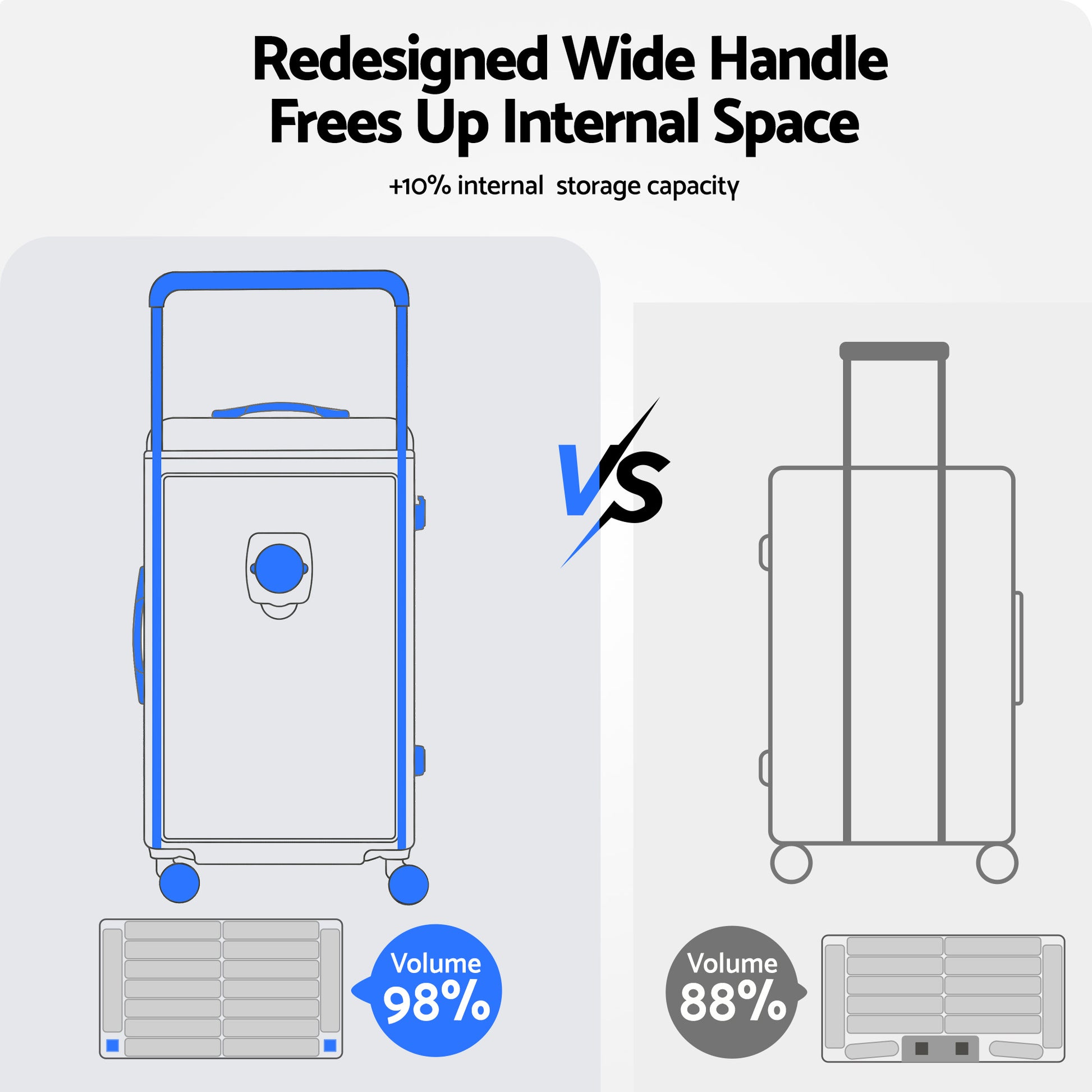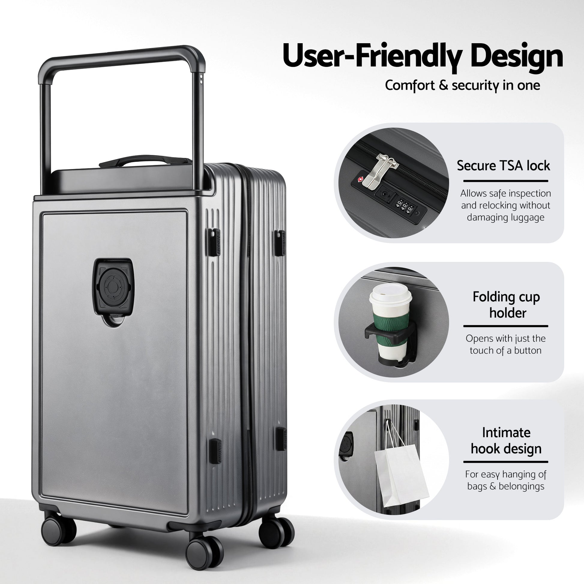 Wanderlite Wide Handle Luggage makes packing a dream, not a chore. With its innovative wide balanced handle design, you'll have more effortless use and an extra 10% packing capacity. Equipped with 360° silent shock-absorbent wheels, it glides smoothly on any surface. Constructed from lightweight, durable PC material with rounded corners for impact resistance. Includes a convenient cup holder and secure TSA lock, ideal for both domestic and international travel.